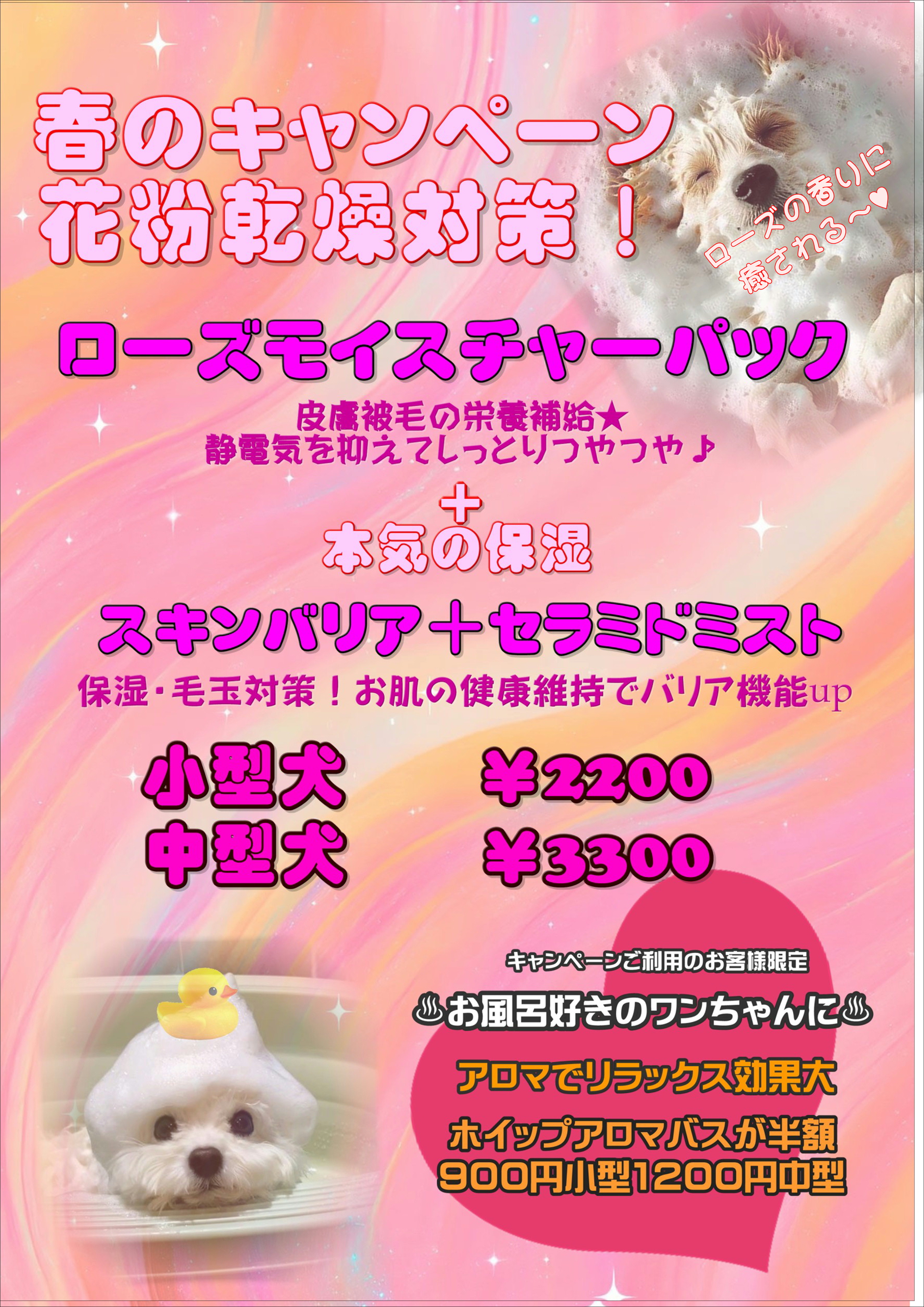 Dogkingは、経験豊かなスタッフが愛犬一匹一匹の状態に合わせた最適なケアを提供しています。花粉の影響が気になり始めるこの季節、ぜひ「ローズモイスチャーパック」と「スキンバリア+セラミドミスト」で大切な愛犬をしっかりとケアし、快適な毎日を過ごしていただければと思います。